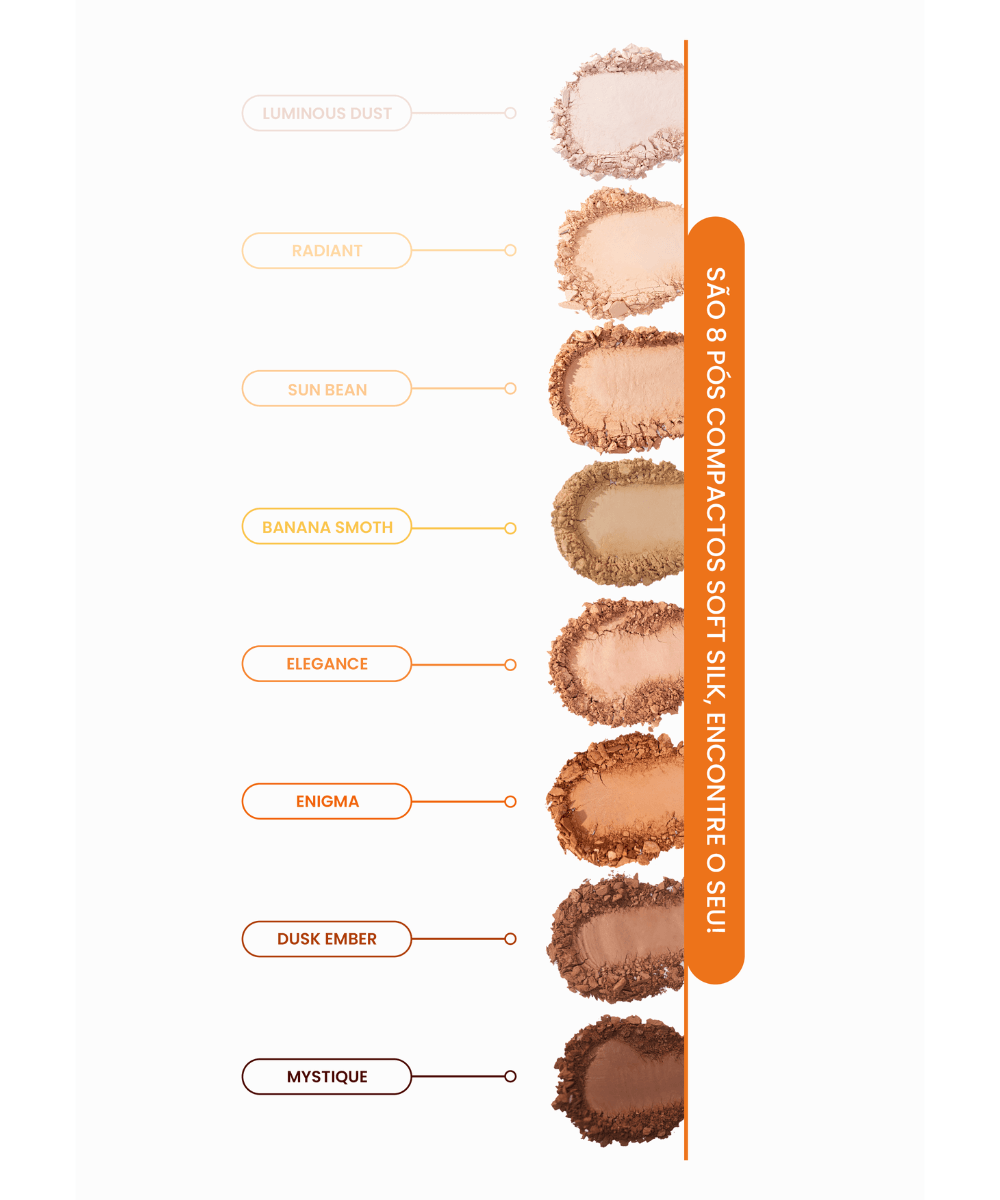 O nosso Pó Compacto Soft Silk é a escolha ideal para finalizar sua maquiagem com perfeição. Ele oferece uma cobertura leve que matifica a pele, reduzindo o brilho indesejado enquanto proporciona um acabamento natural e aveludado. Com uma textura ultrafina, o pó ajuda a fixar a maquiagem e suavizar a aparência de imperfeições.