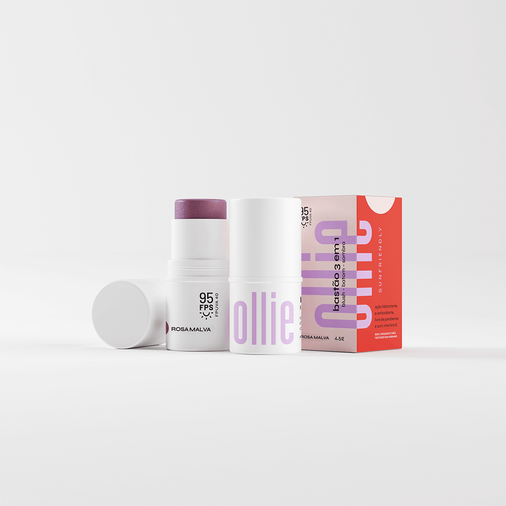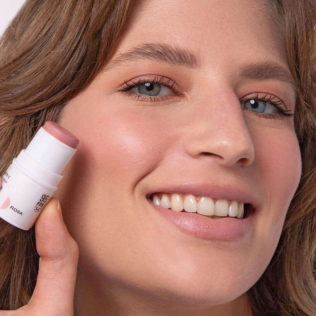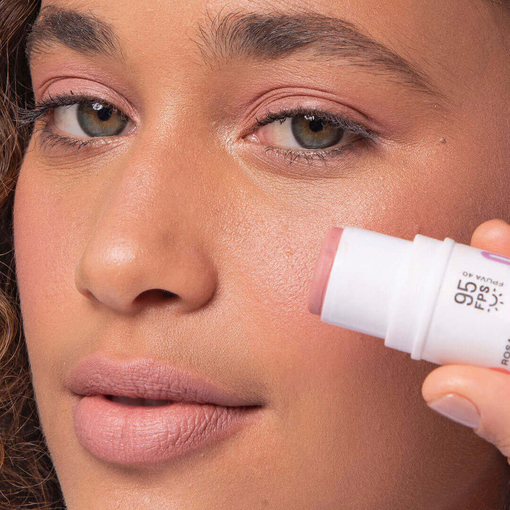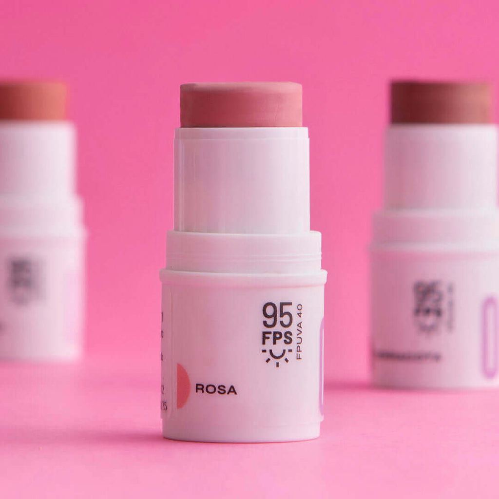 Nosso em Bastão 3 em 1 FPS 95 é multifuncional e pode ser usado como blush, batom e sombra. Está disponível em 5 cores, sendo 2 com brilho - Terracota e Coral e 3 opacas - Rosa, Rosamalva e Amora.