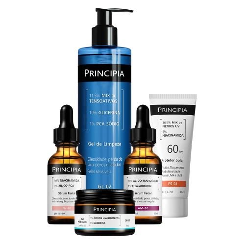 Kit avançado com alta eficácia anti-manchas: um gel de limpeza com mix de tensoativos + PCA sódio + glicerina, um gel hidratante com ácidos hialurônicos + glicerina, um sérum de niacinamida + zinco PCA, um sérum de ácido mandélico + alfa arbutin e um protetor solar fluido antioleosidade com mix de filtros + niacinamida, FPS 60, toque seco e com eficácia contra raios UVA e UVB.