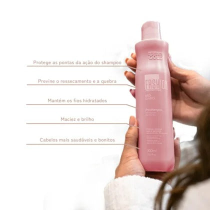 O Pré-Shampoo protege os seus cabelos pré-lavagem, impedindo que os seus cabelos fiquem ressecados ou com frizz.